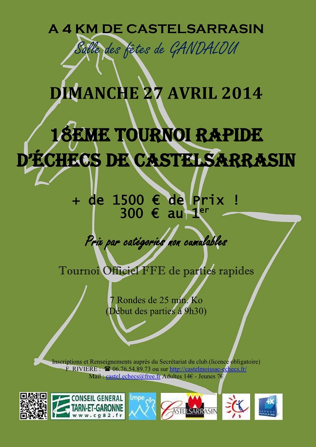 Le 18e tournoi rapide d’échecs de Castelsarrasin aura lieu dimanche 27 avril 2014, dans la salle des fêtes de Gandalou, à 4 Km de Castelsarrasin (situé au centre du village. La salle Paul Descazeaux indisponible car étant actuellement en travaux....)