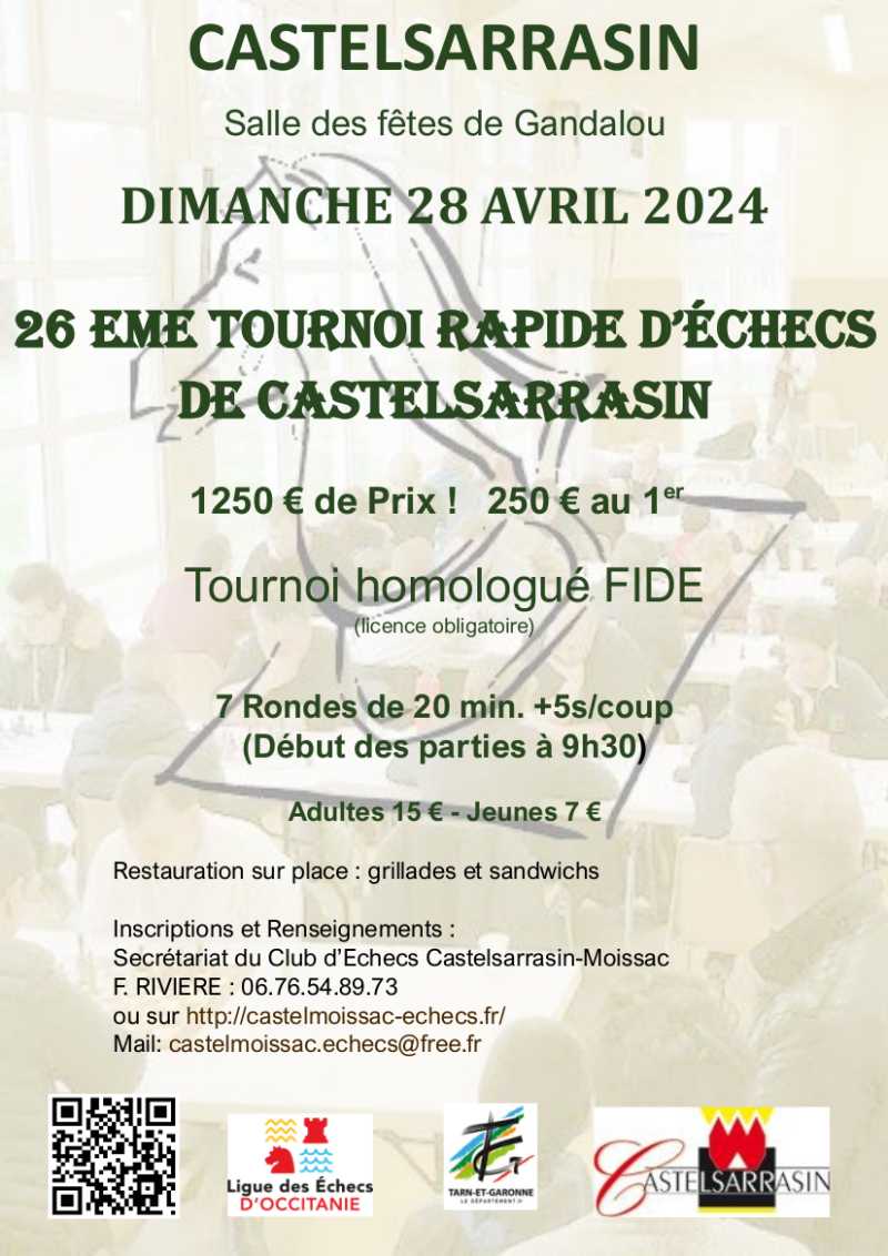 Le 26e tournoi rapide d’échecs de Castelsarrasin aura lieu dimanche 28 avril 2024, dans la salle des fêtes de Gandalou, à 4 Km de Castelsarrasin (situé au centre du village).