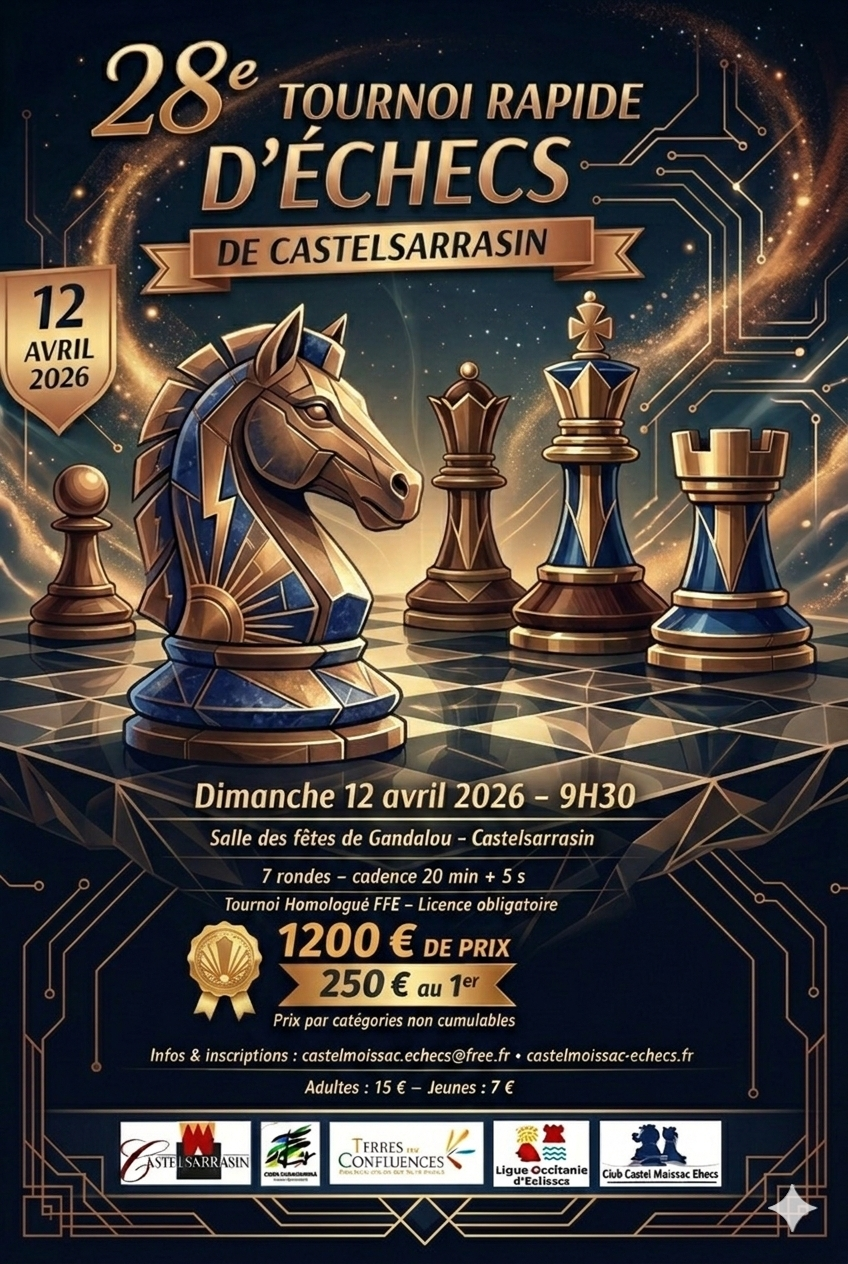 Le 28e tournoi rapide d’échecs de Castelsarrasin aura lieu dimanche 12 avril 2026, dans la salle des fêtes de Gandalou, à 4 Km de Castelsarrasin (situé au centre du village).