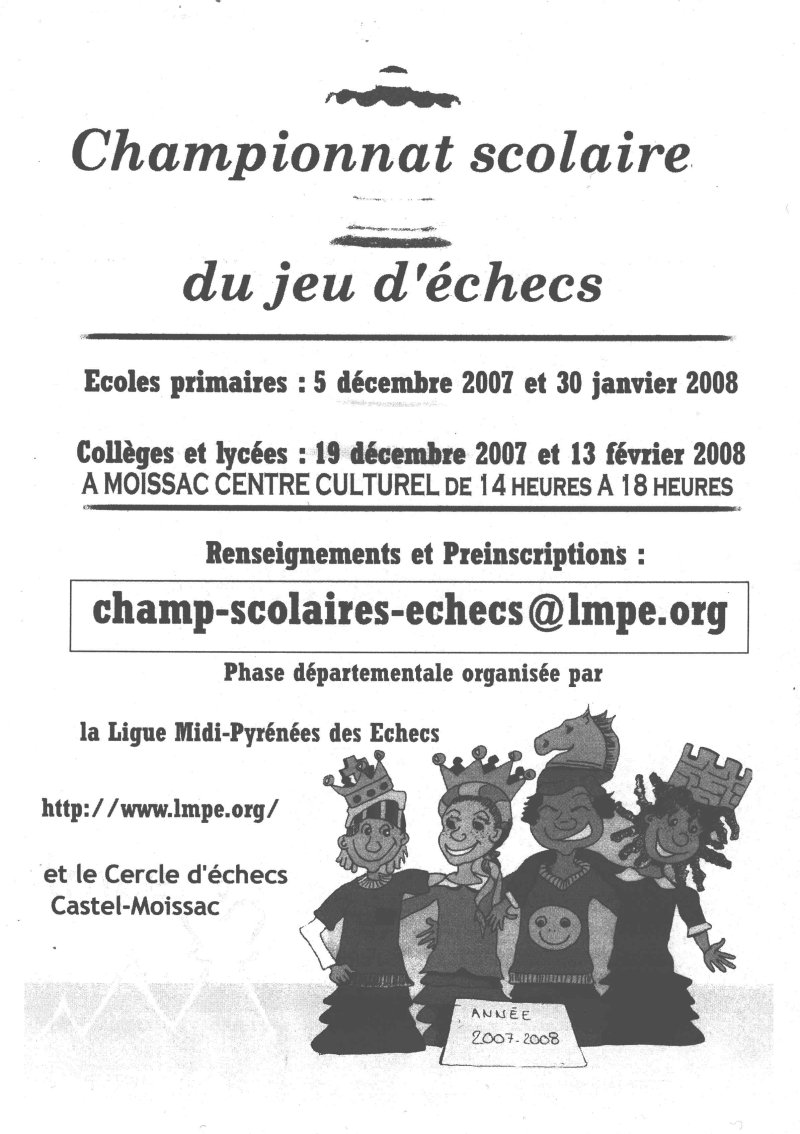 Les établissements qui veulent participer doivent envoyer la fiche d’inscription à M. Grézels, collège J. Rostand 82400 Valence d’Agen ou envoyer un e-mail à champ-scolaires-echecs chez lmpe.org. avant le vendredi 30 novembre 2007 pour les écoles et le vendredi 14 décembre pour les collèges et lycées.